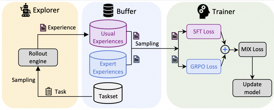 本指南将会介绍如何将相对复杂的 RL 算法集成到 Trinity-RFT 中。 作为示例,我们引入了由更高级别的 LLM 生成的一些“专家”数据,并提出了一种名为 MIX 的算法,该算法优化以下策略目标: